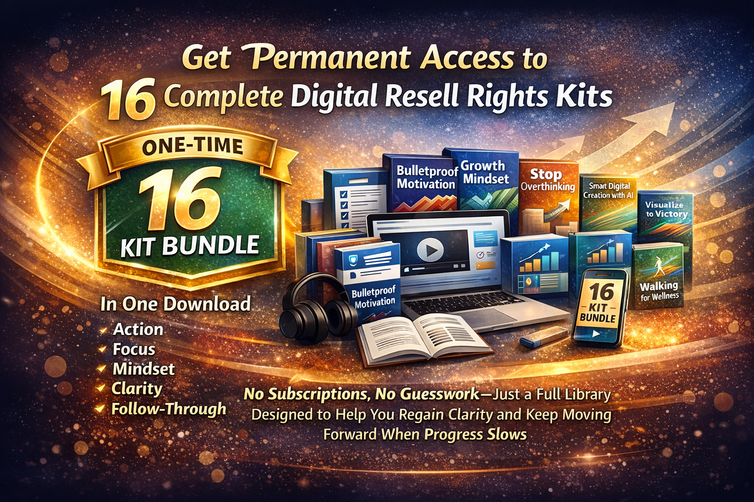 You get 16 complete digital kits in one download—each designed to help you move forward when motivation drops, focus slips, or overthinking takes over.